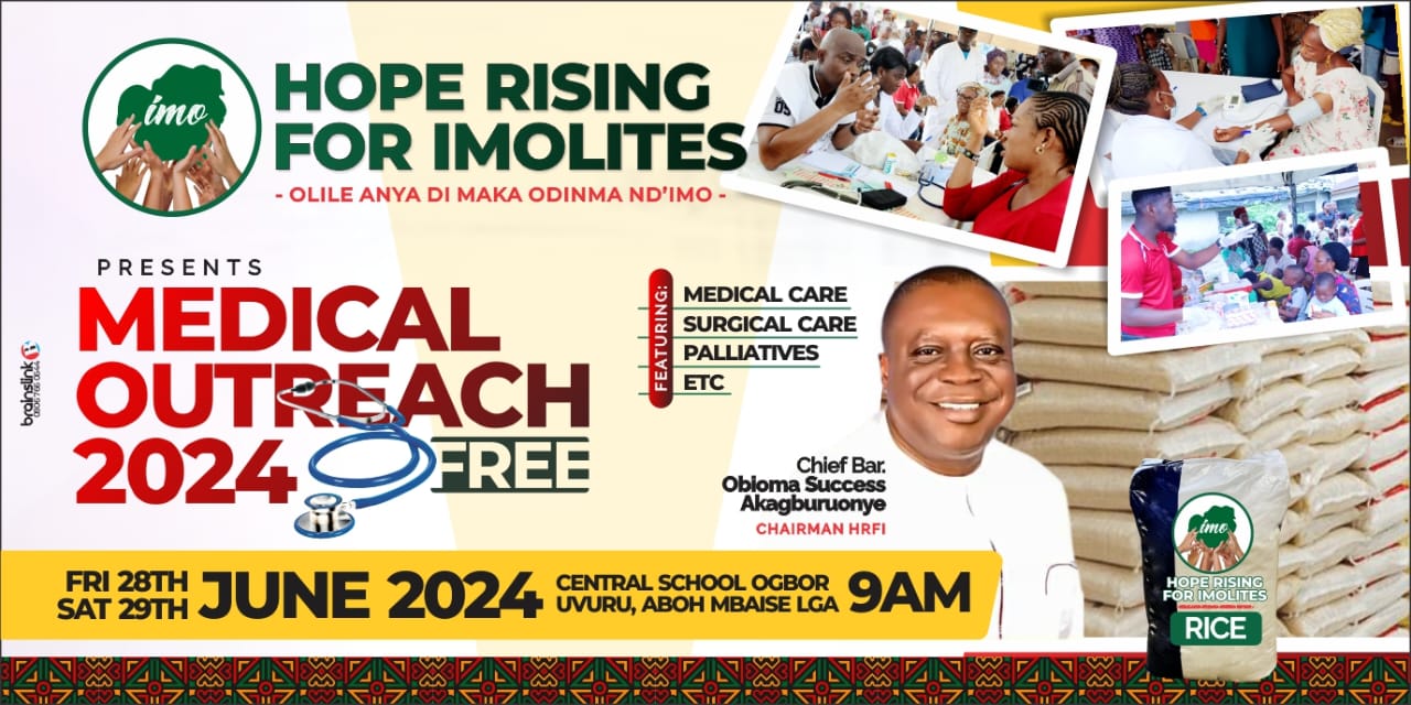 Central School Ogbo, Ovuru, Aboh Mbaise LGA, Imo State Central School Ogbo, Ovuru, Aboh Mbaiseoin HopeRising for Imolites for a two-day free medical outreach event in Aboh Mbaise LGA, Imo State. Our team, led by founder Barr. Obioma Success Akagburuonye, will provide essential medical...
